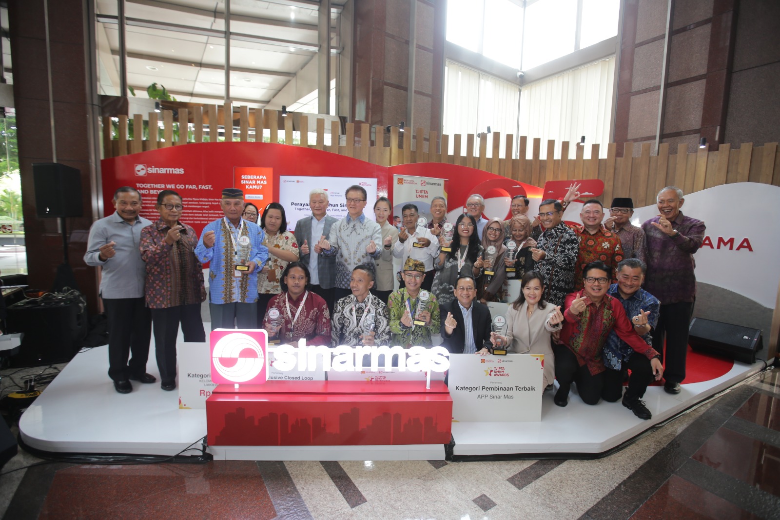 Board Member Sinar Mas Franky Widjaja dan Muktar Widjaja berfoto bersama para juara Tjipta UMKM Award binaan Pilar Bisnis Sinar Mas, di perayaan HUT Sinar Mas ke 85 Tahun, Jakarta (03/09/2023).