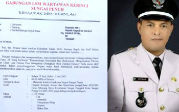Jambi, BULETIN.CO.ID – Sejumlah gabungan LSM dan aktivis dari Kota Sungai Penuh dan Kabupaten Kerinci menggelar aksi demonstrasi di depan Kantor Inspektorat Kota Sungai Penuh, Selasa (10/06/25), menuntut transparansi dan akuntabilitas penggunaan Dana Desa Pelayang Raya untuk periode 2021–2024.