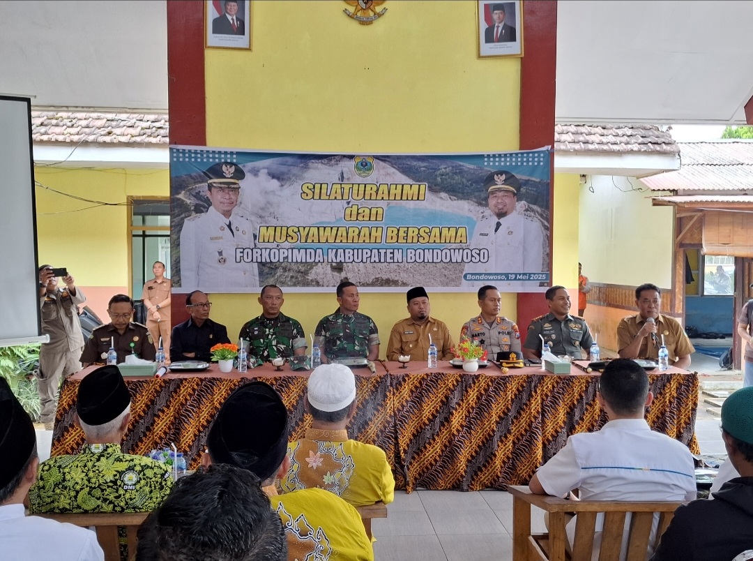 Forkopimda Bondowoso, Danyon 514 dan DanBrigif 9 saat melakukan audiensi dengan warga Desa Kali Gedang Kecamatan Ijen, Senin,19/05/2025.(Foto: Nang/BULETIN)