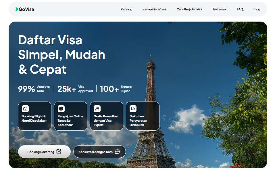 GoVisa adalah layanan profesional pengurusan visa ke luar negeri yang sudah membantu lebih dari 25.000 traveler Indonesia mendapatkan visa mereka dengan approval rate 99%.