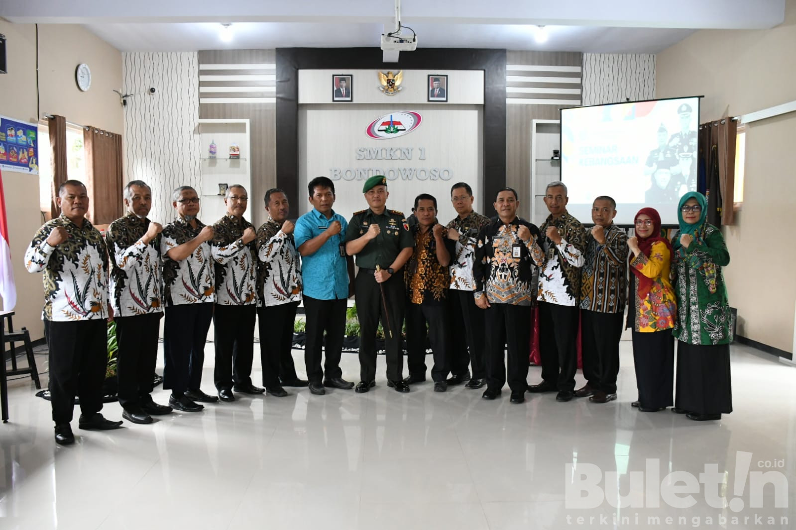 Bondowoso, BULETIN.CO.ID – Dandim 0822/Bondowoso Letkol Arm Suhendra Chipta, M.Tr.Hanla., memberikan Seminar Kebangsaan dengan Tema “Menyiapkan Pelajar SMAN dan SMKN Yang Tangguh Dan Berwawasan kebangsaan” bertempat di Ruang Meeting SMKN 1 Bondowoso Jl. HOS. Cokroaminoto Kecamatan/Kabupaten Bondowoso, Kamis (26/1).