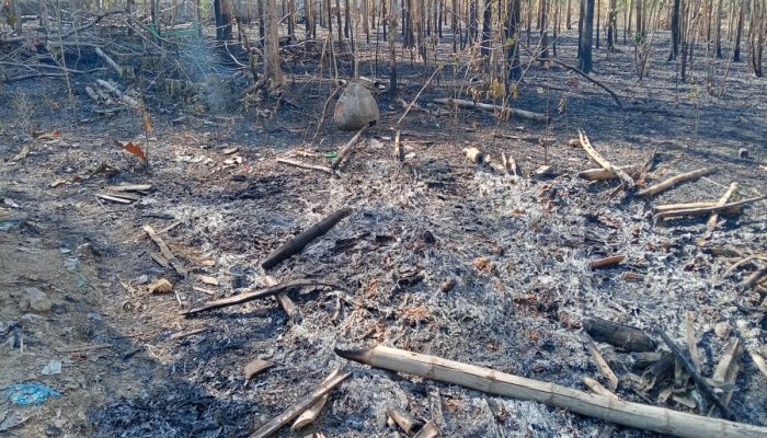 Pantauan di lokasi, lahan yang terbakar begitu luas berada tepat di belakang rumah korban. Nampak pohon jati berjejer dengan ranting pohon yang kering. Asap bekas daun terbakar masih nampak dan kondisi udara masih terasa panas.