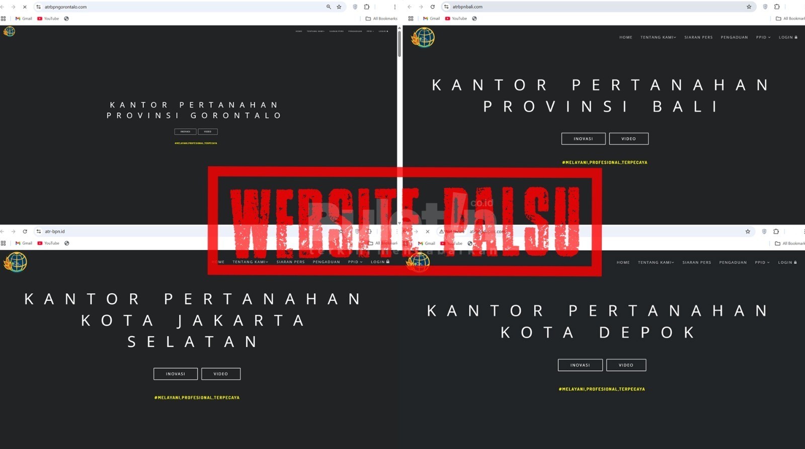 Harison Mocodompis mengungkapkan, pihaknya telah menerima sejumlah laporan terkait website palsu yang menyerupai portal resmi milik Satker-satker Kementerian ATR/BPN. Website tersebut menduplikasi isi dari website resmi Satker Kementerian ATR/BPN sehingga jika tidak teliti, masyarakat bisa mengira itu adalah situs resmi.
