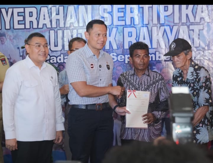 Padang, BULETIN.CO.ID – Kementerian Agraria dan Tata Ruang/Badan Pertanahan Nasional (ATR/BPN) melakukan penghormatan kepada tanah ulayat di Indonesia melalui sertipikasi tanah ulayat/tanah masyarakat hukum adat. Hal ini disampaikan oleh Wakil Menteri (Wamen) ATR/Wakil Kepala (Waka) BPN, Ossy Dermawan, pada kegiatan Penyerahan Sertipikat Tanah untuk Rakyat, di Kerapatan Adat Nagari (KAN) Kuranji, Kota Padang, Selasa (30/09/2025).