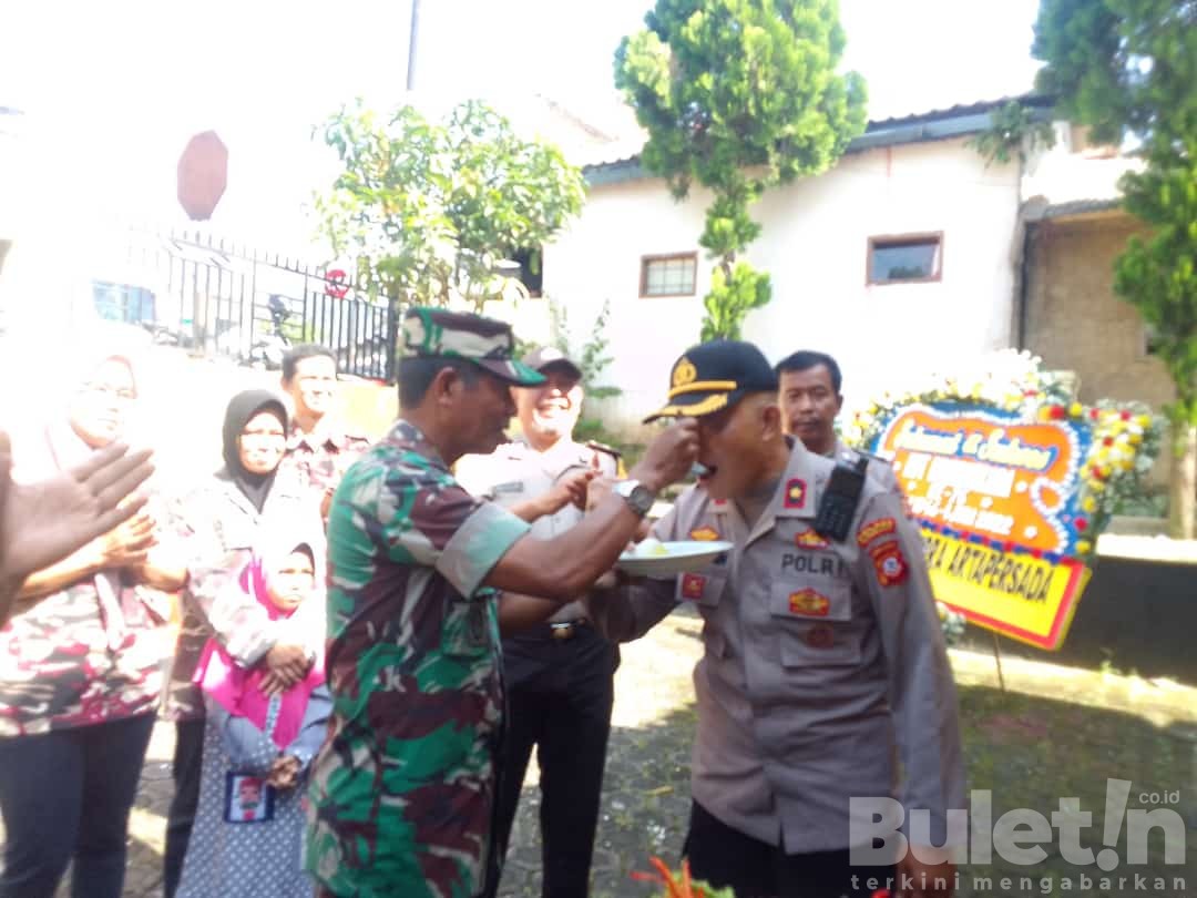 Saling menyuapi makanan Tumpeng Oleh Danramil Cibeber kepada Kapolsek Cibeber sebagai tanda TNI dan Polri selalu solid dalam menjaga Keamanan dan Ketertiban. (Rustam)