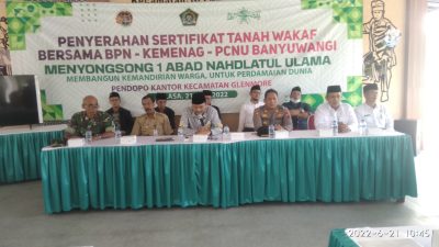 Seperti yang disampaikan oleh Gatot Suyono, Camat Glenmore, Acara terselenggara dengan Penyerahan Sertifikat tanah wakaf Bersama Kemenag, BPN, dan PCNU kabupaten Banyuwangi.