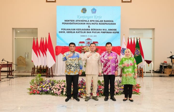 Manado, BULETIN.CO.ID – Menteri Agraria dan Tata Ruang/Kepala Badan Pertanahan Nasional (ATR/BPN), Nusron Wahid menyaksikan penandatanganan Nota Kesepahaman/MoU antara Kantor Wilayah (Kanwil) BPN Provinsi Sulawesi Utara (Sulut) dengan berbagai lembaga keagamaan. Penandatanganan ini dilakukan di Wisma Negara Bumi Beringin, Kantor Gubernur Sulawesi Utara pada Kamis (17/07/2025). Secara garis besar, tujuan kerja sama ini adalah untuk percepatan sertipikasi aset tanah milik lembaga keagamaan.